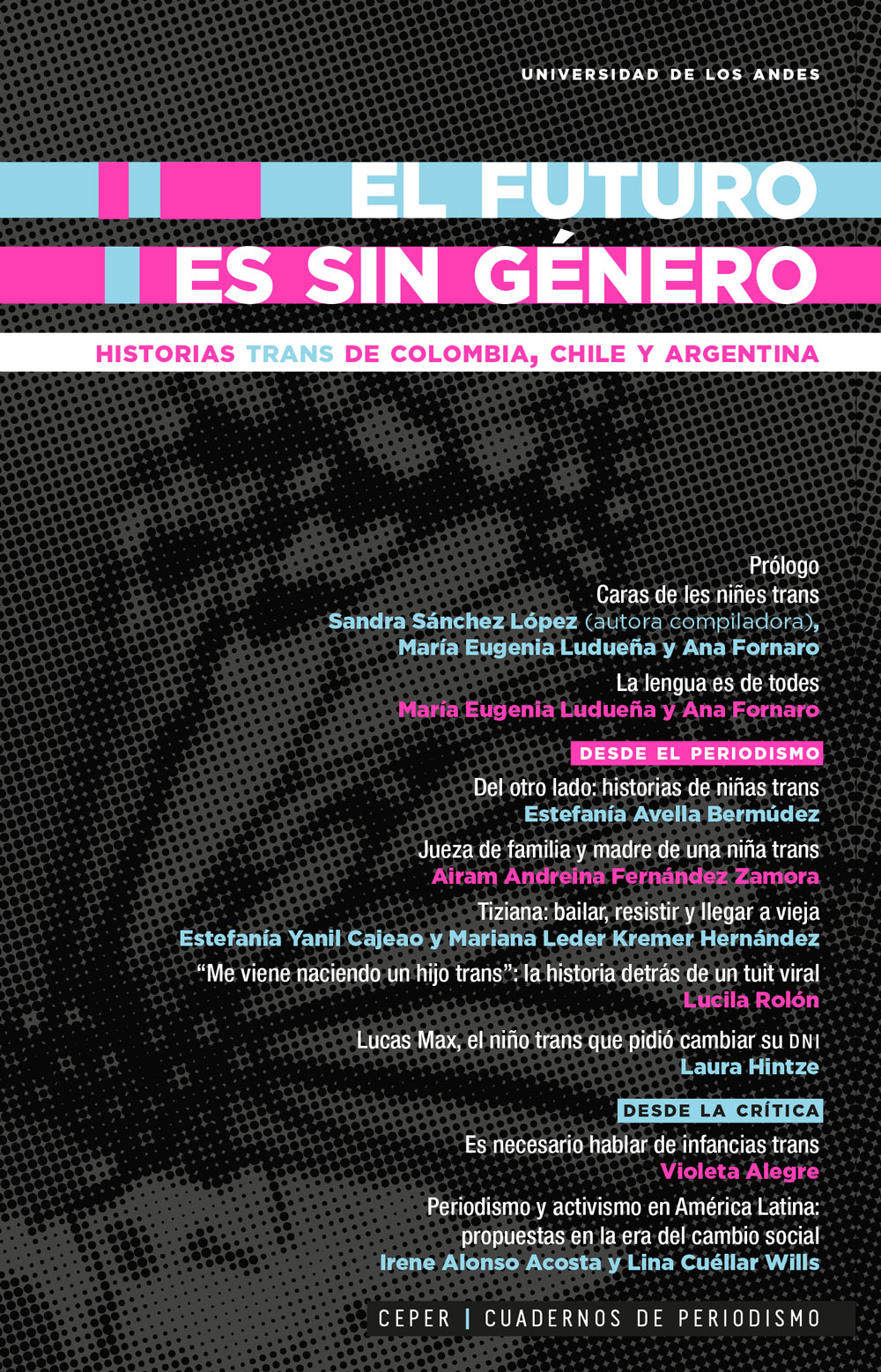 EL FUTURO ES SIN GÉNERO CUENTA HISTORIAS DE PERSONAS TRANS DE TRES LUGARES EN AMÉRICA LATINA: COLOMBIA, ARGENTINA Y CHILE. ADEMÁS DE REPORTAJES, ENTREVISTAS Y CRÓNICAS, ESTE TÍTULO PRESENTA REFLEXIONES SOBRE UN OFICIO PERIODÍSTICO INCLUYENTE, EN EL QUE HAGAMOS MÁS TRANSPARENTE EL COMPROMISO POLÍTICO DE LA COMUNICACIÓN Y DEJEMOS ATRÁS LOS TEMORES Y LOS PREJUICIOS FRENTE A LOS ENCUENTROS ENTRE PERIODISMO Y ACTIVISMO. CENTRADO EN LAS VIDAS Y VOCES TRANS, ESTE CONJUNTO DE APORTES PLANTEA QUE LA CONVERSACIÓN PÚBLICA SE ENRIQUECE CUANDO DEJAMOS DE ESQUIVAR LOS DILEMAS QUE TENEMOS AÚN POR RESOLVER COMO SOCIEDAD, MIENTRAS CIUDADANES FUERTES, CON EMPEÑO, LLEVAN ADELANTE SUS LUCHAS.